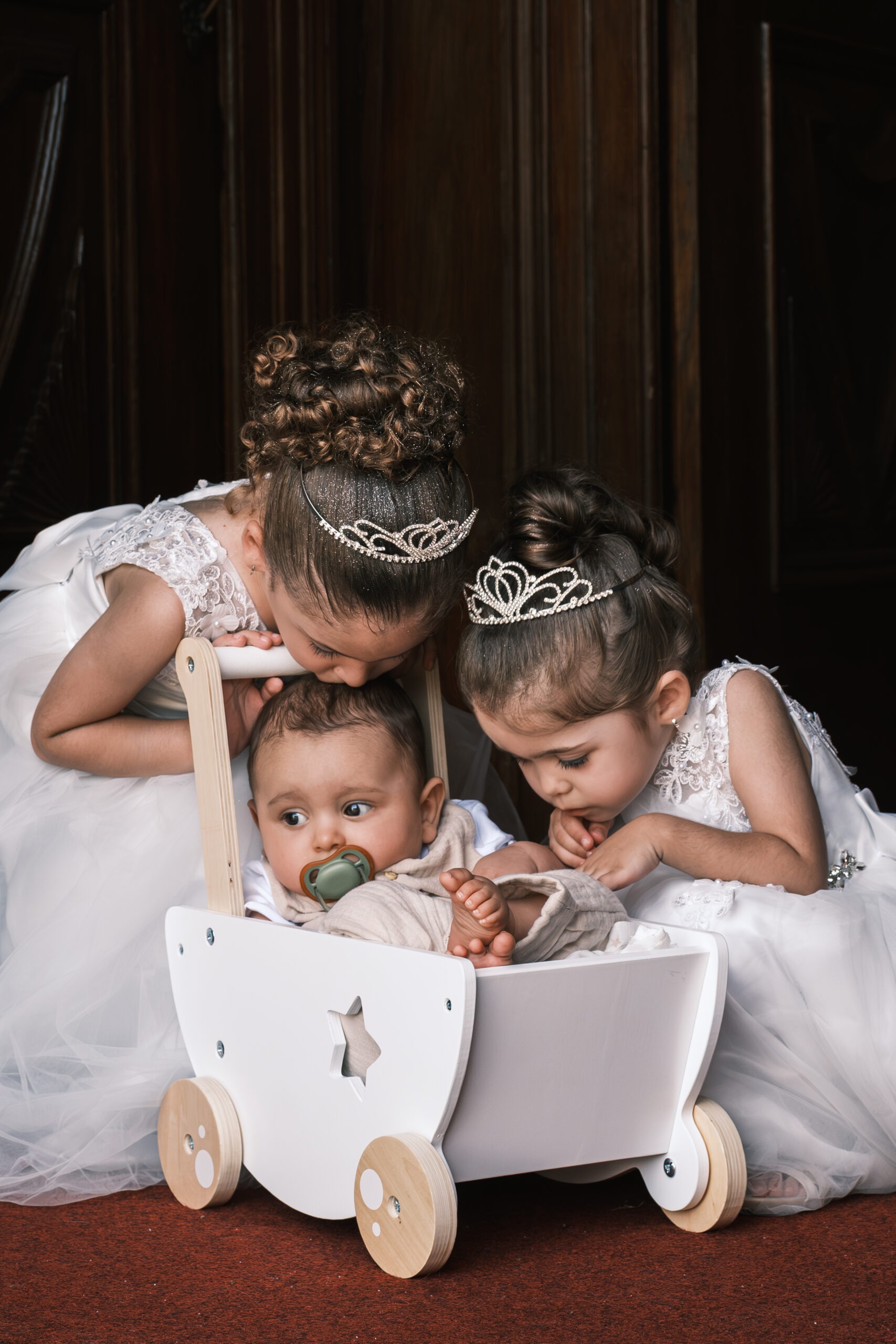 Duas meninas com tiara a espreitar o irmão bebé num carrinho de brincar, momento terno no interior, instantes antes da entrada na igreja em Aveiro, registo documental.