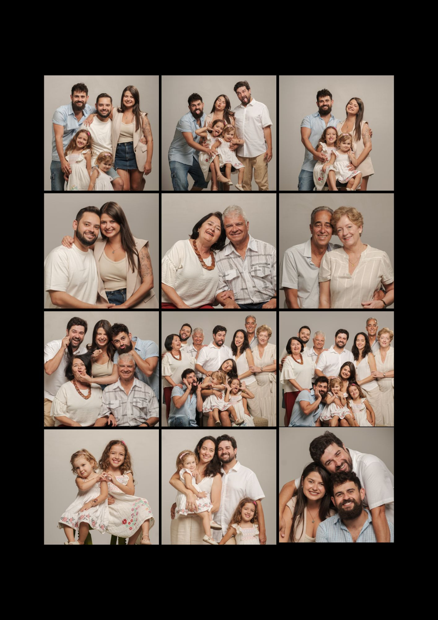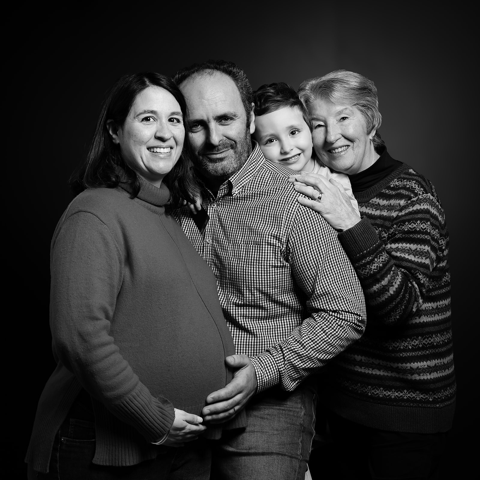 No fundo preto trabalho a luz com precisão para destacar expressões e gestos. O resultado em preto e branco é clássico e forte, sem distrações, centrado no que realmente importa: a vossa ligação.